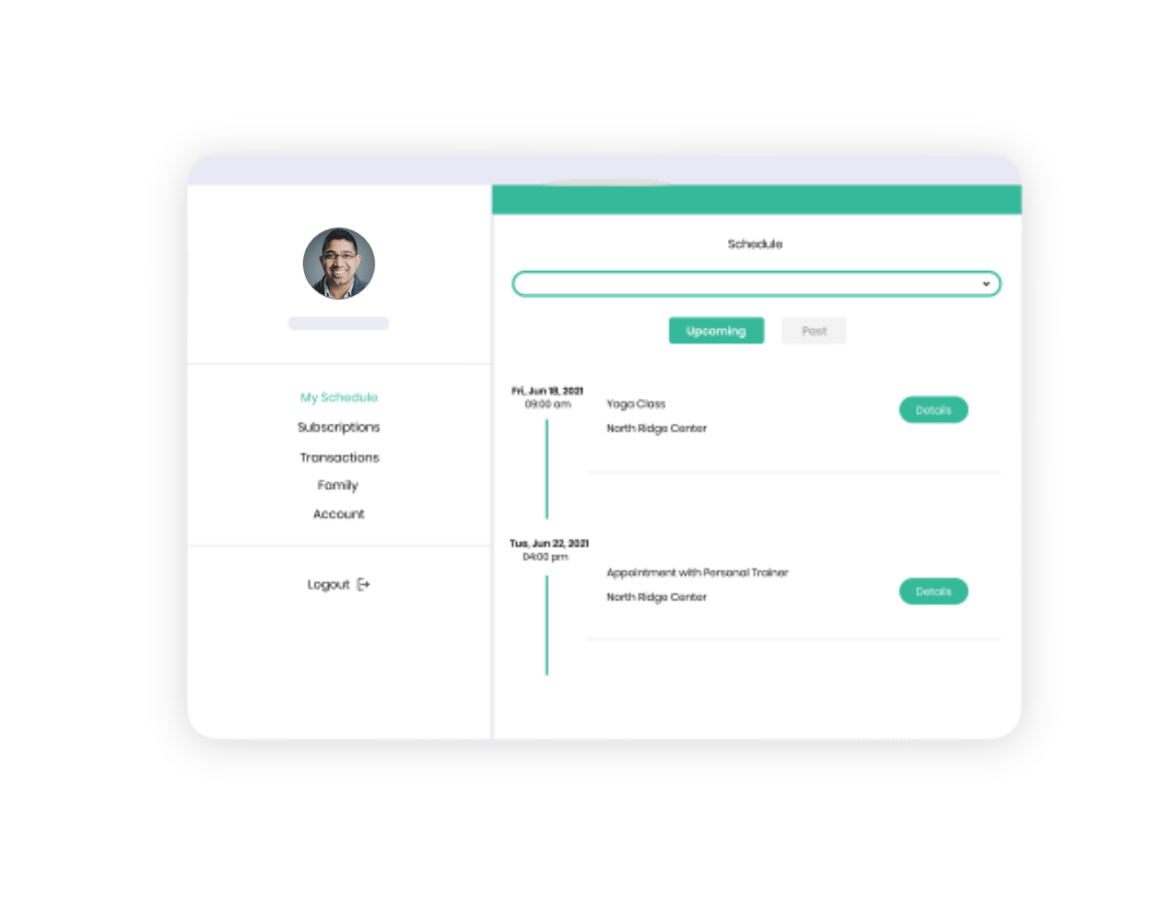 Provide more control to your clients through a single portal. Allow them to access past and upcoming bookings, track payment history, manage family member’s data, and view all active subscriptions and memberships.